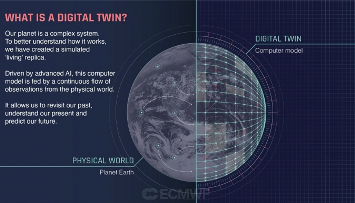 The European Commission is creating a digital twin of the earth named “DestinE”. It is going to be a virtual representation of all the physical processes of the earth`s surface including human influences on food, water, and energy flows as well as geophysical and meteorological systems to assess the climate impact now and far into the future. This model can be used to show if a dike can prevent flooding in the Netherlands or the effect of deforestation in the Amazon or even help policy makers reach decisive agreements to curb global warming based on simulations using the digital twin relying on key insights faster.